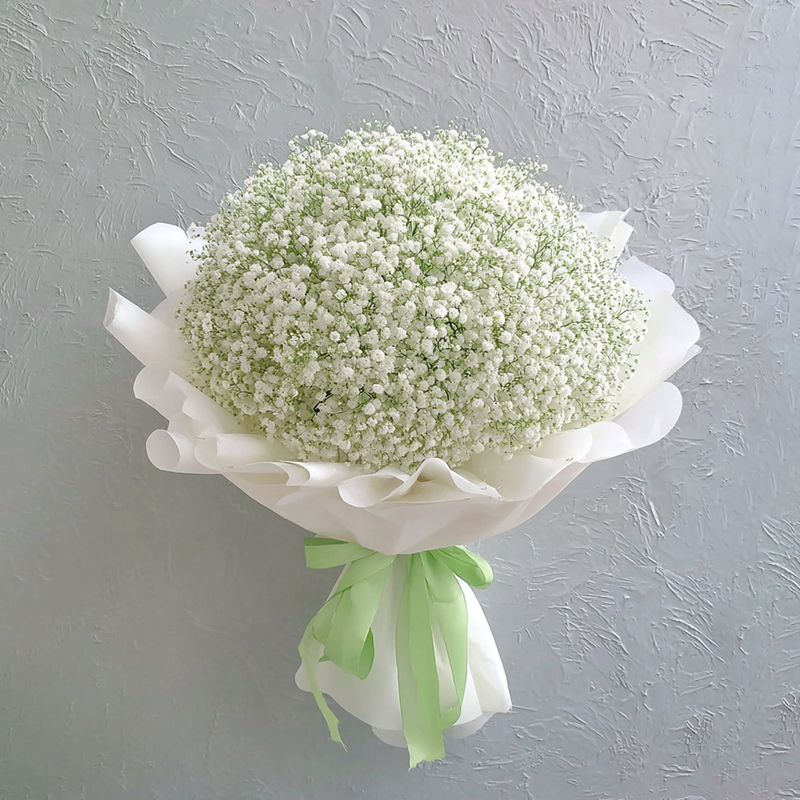 The pure white wrapping, like a veil of night, softly enfolds the starlight,while a green ribbon ties a knot of spring.As if the quiet glow of the galaxy has been gathered into this fragrant embrace.Each delicate bloom trembles slightly, whispering:"With stars as words and tenderness as ink, I give you a whole tranquil night."